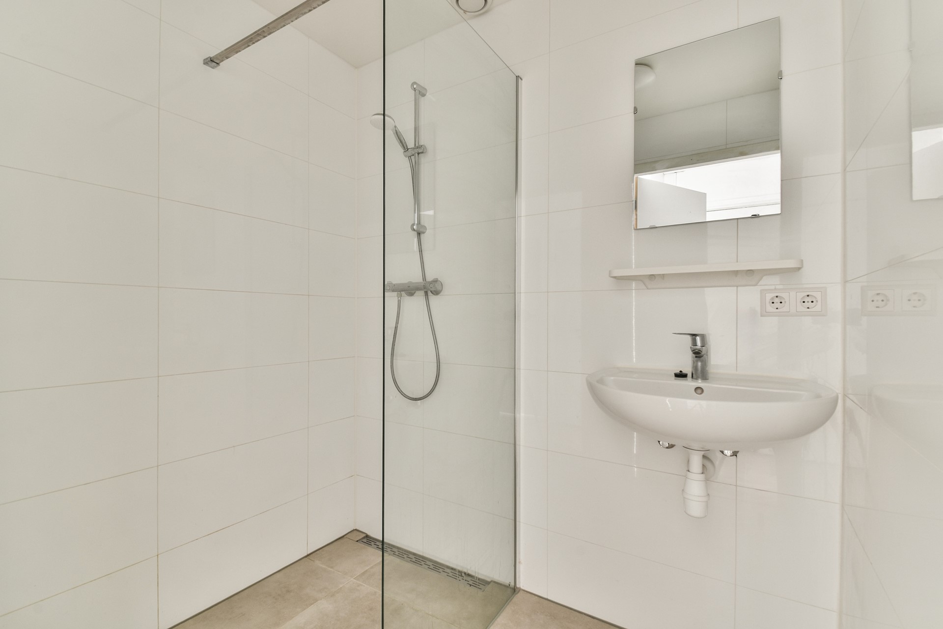 The kitchen is stylish with a modern look with a straight layout and built-in appliances. A RVS ventilation hub, induction cooking plate (electric), dishwasher, combi-oven, fridge/freezer. The wite stone finish countertop makes the kitchen complete.