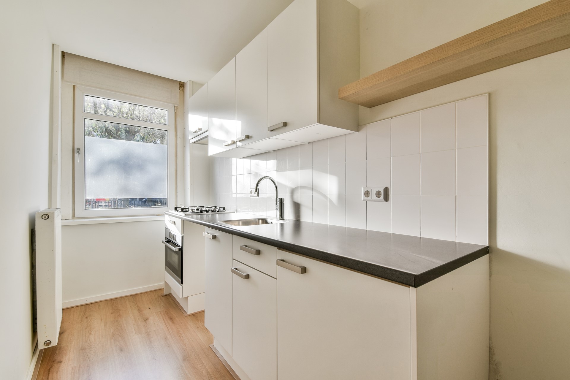 Practical closed kitchen equipped with gas hob, oven, extractor hood and ample cabinet space. The window provides pleasant light and a view of the quiet street.