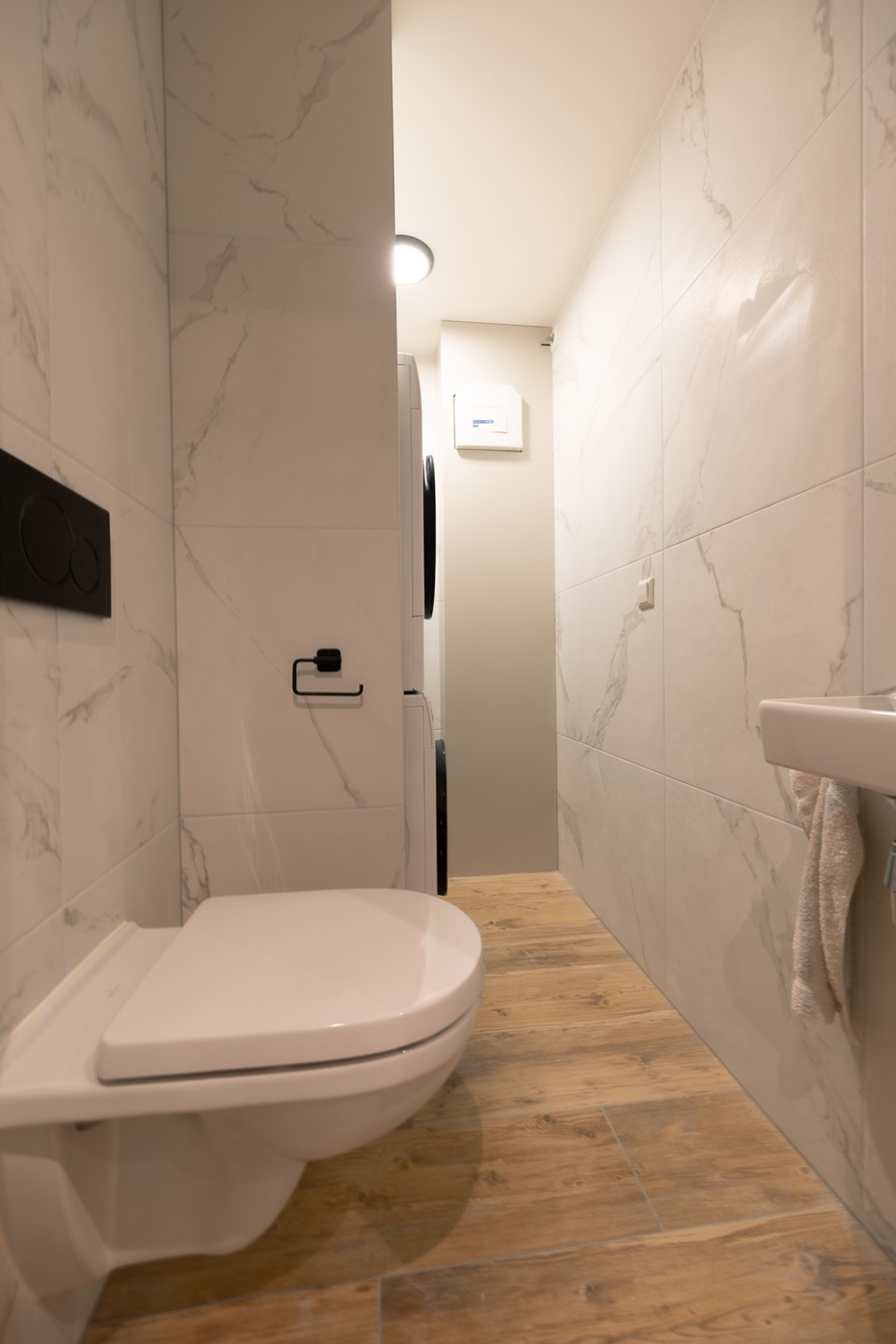 Lichte en sfeervolle woonkamer met grote raampartijen, strakke afwerking en een open verbinding met de keuken. De ruimte voelt ruim en comfortabel aan. De gehele ruimte is voorzien van vloerverwarming en een stijlvolle houtlook stenen vloer.