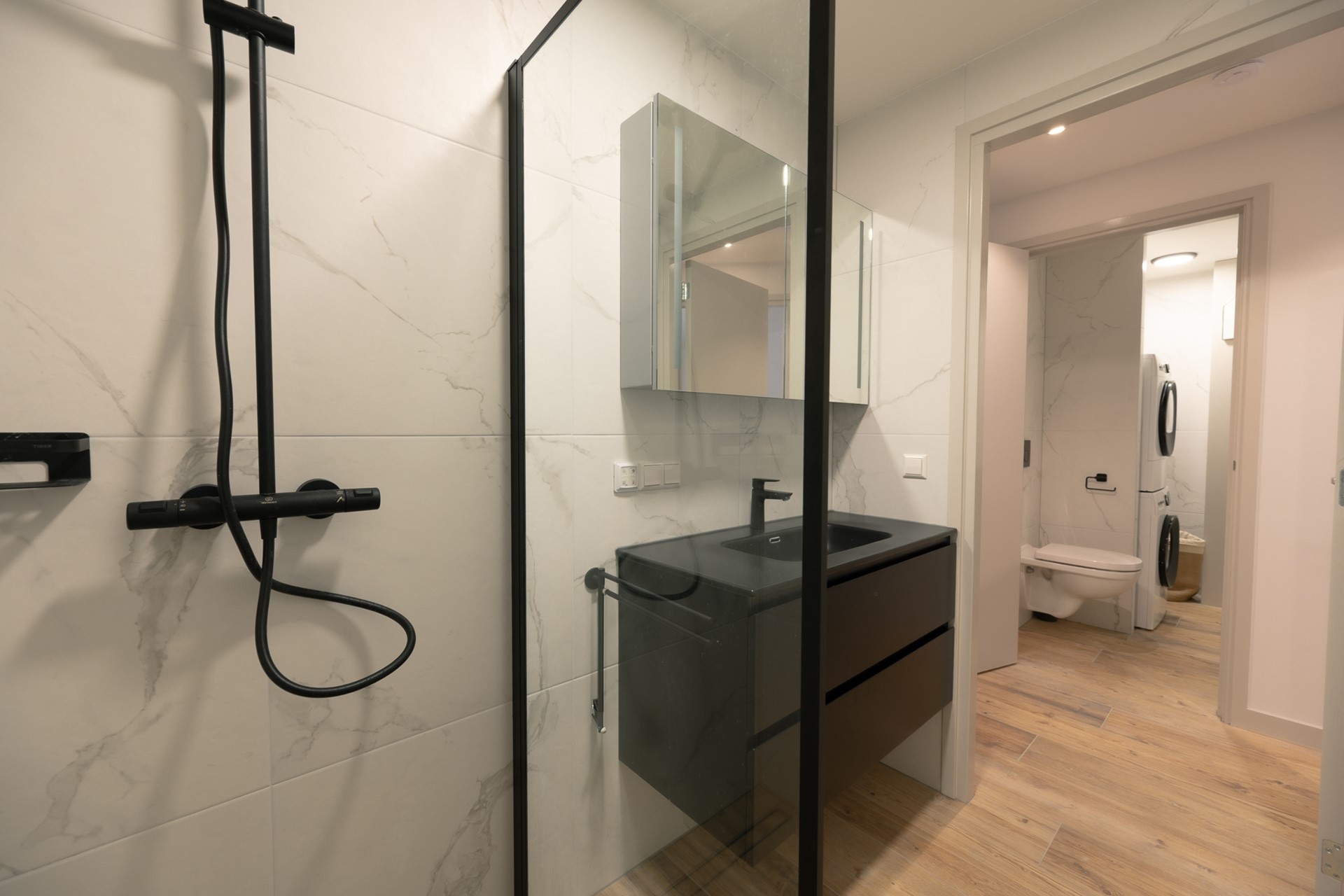 Stijlvolle, modern uitgevoerde badkamer met inloopdouche, wastafelmeubel en hoogwaardige afwerking.