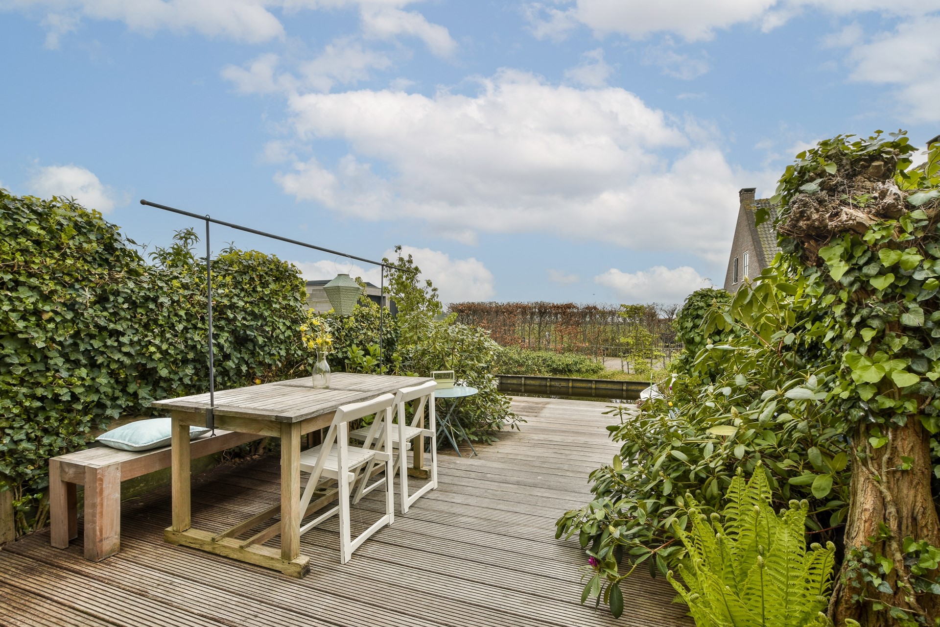 • Zonnige achtertuin op het met houten vlonder, meerdere zithoeken en uitzicht op water — veel privacy