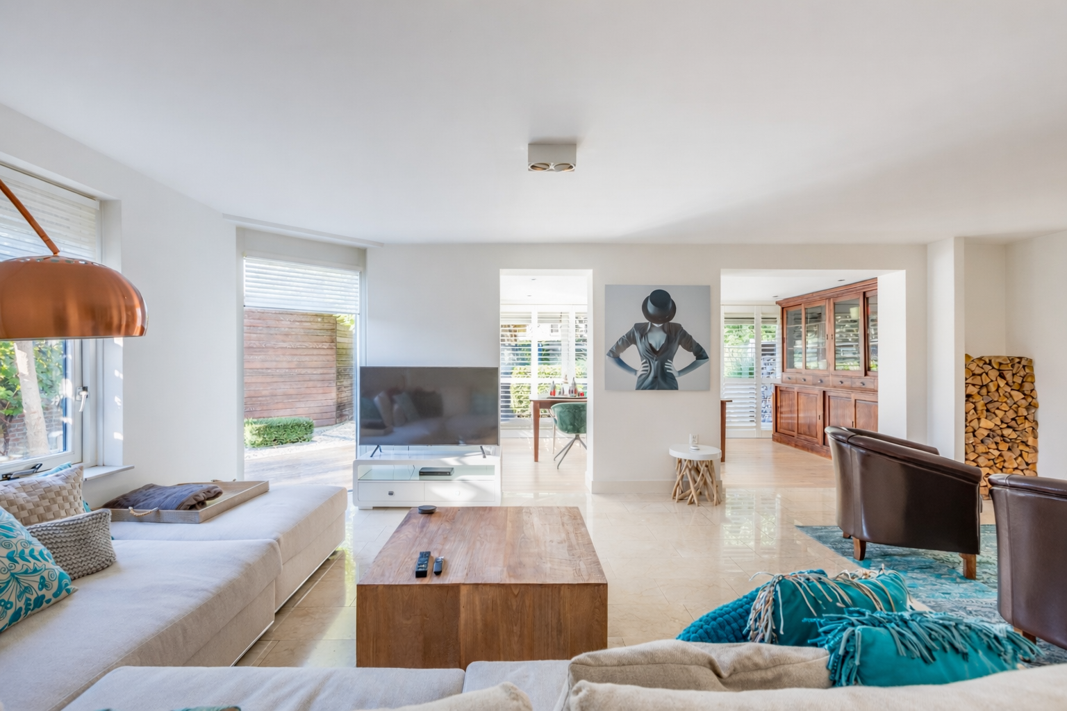 • Royale, lichte woonkamer met speelse indeling en sfeervolle openhaard