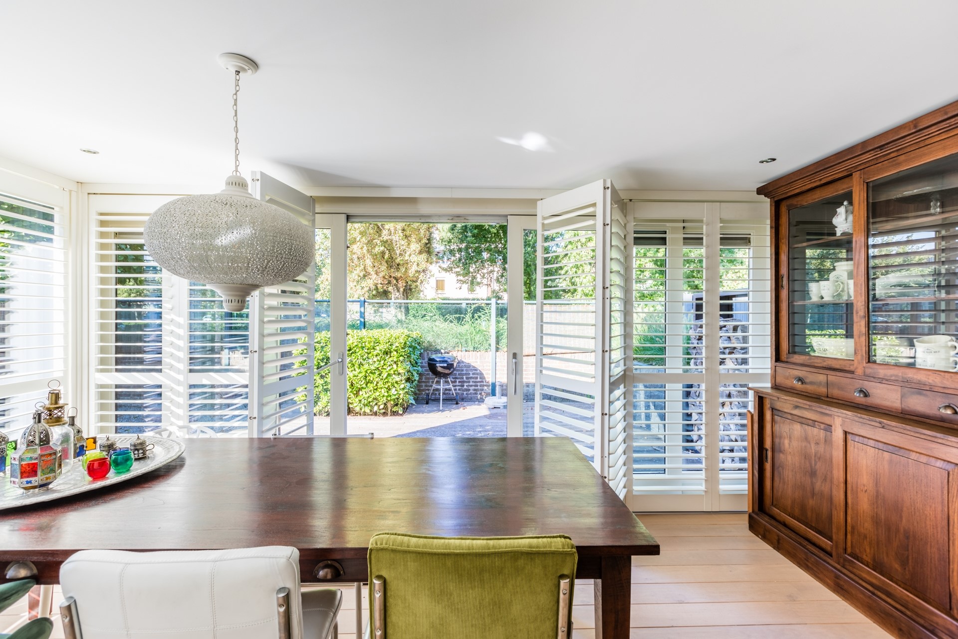 Aan de achterzijde is een kwalitatieve uitbouw, waardoor de woonkamer extra ruim aanvoelt en er een prachtige plek is ontstaan voor de eethoek. De uitbouw beschikt over grote raampartijen tot aan het plafond, voorzien van shutters, en openslaande deuren naar de tuin.