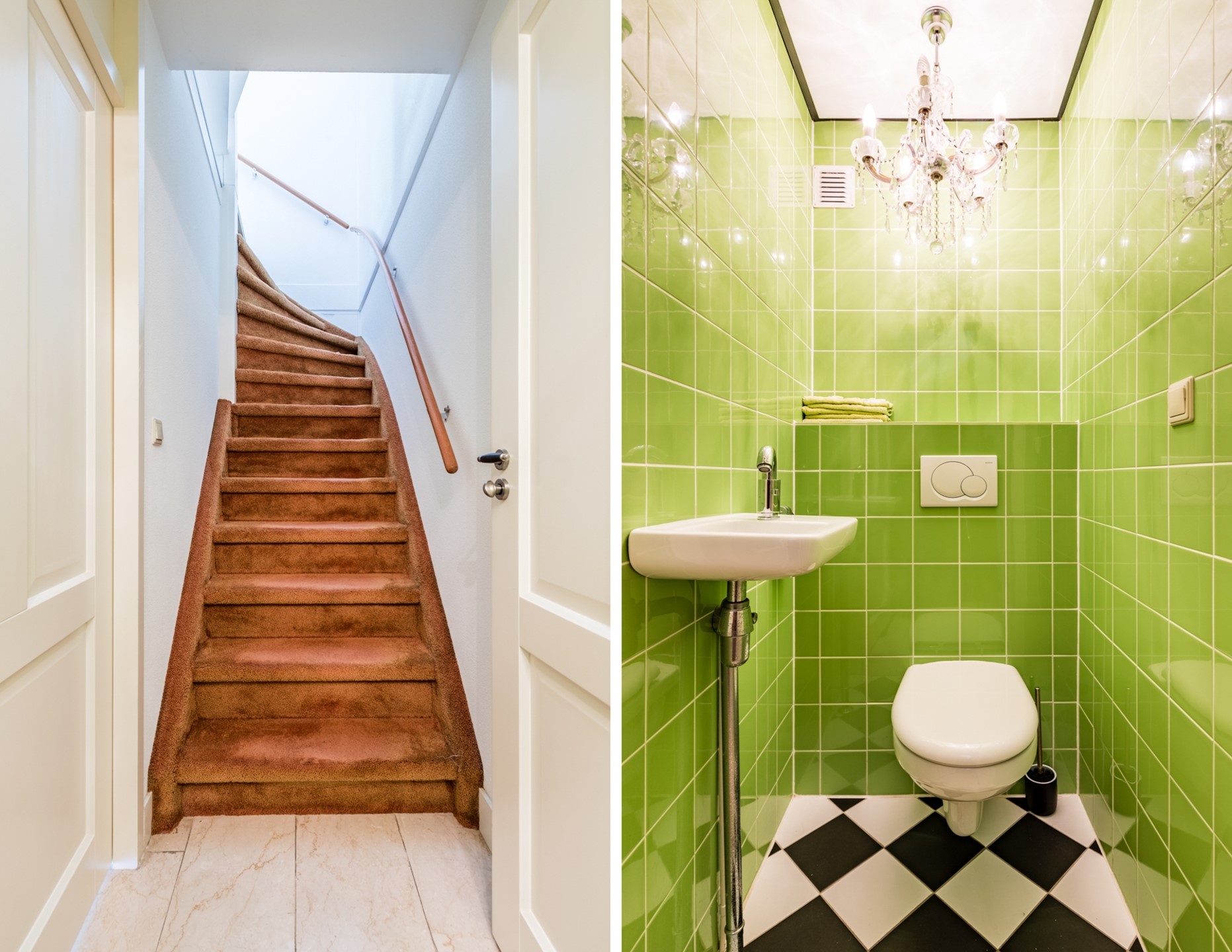 Op de begane grond ligt een hardstenen vloer en deels parket, beide voorzien van vloerverwarming. Vanuit de woonkamer bereik je via een deur de trapopgang naar de eerste verdieping. Achter deze deur bevindt zich tevens het eerste toilet.
