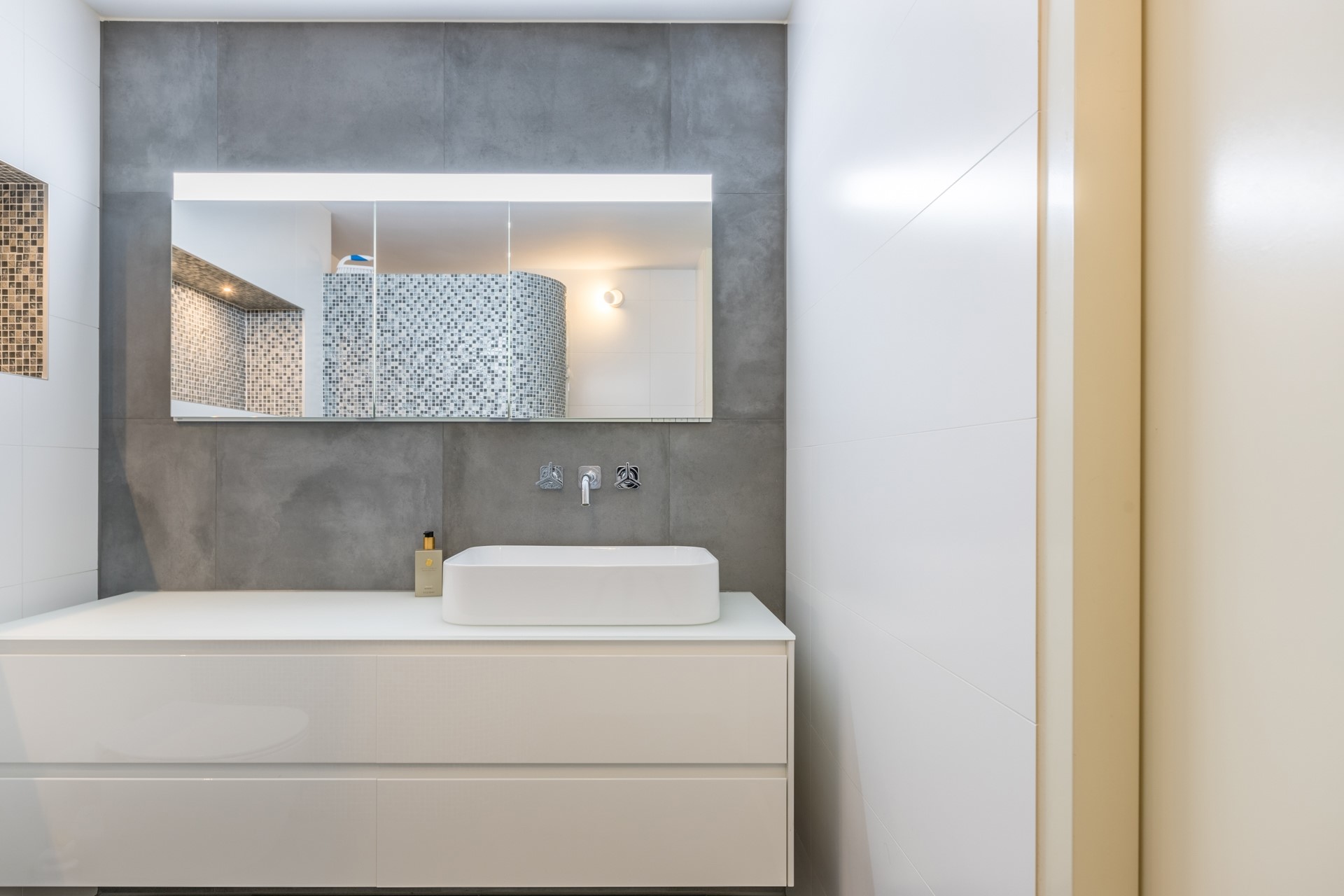 De badkamer is betegeld tot aan het plafond en voorzien van een ruime inloop(regen)douche, een breed wastafelmeubel, een brede spiegel met inbouwverlichting en een tweede zwevend toilet.