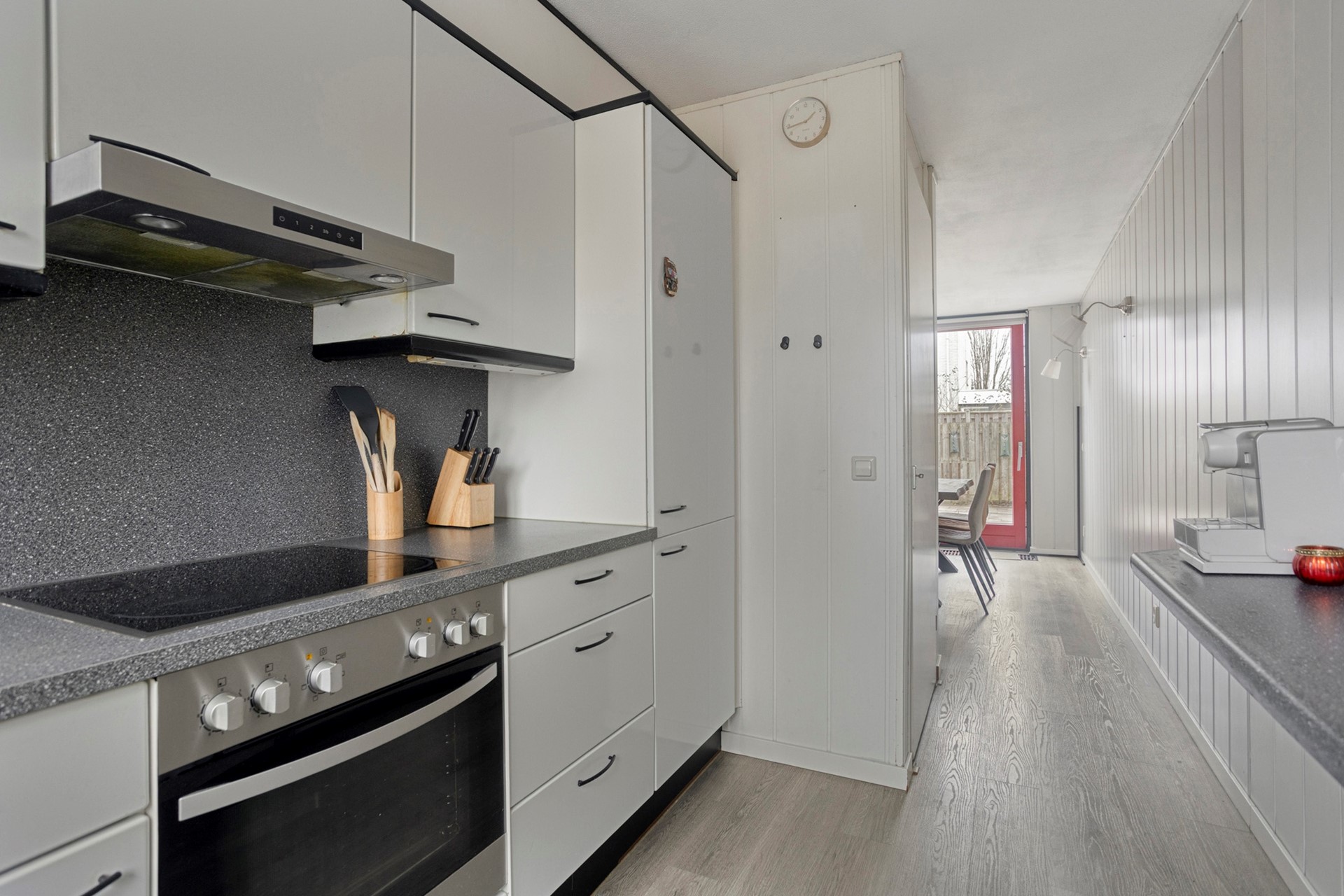 De keuken, gelegen aan de voorzijde, is praktisch ingericht en voorzien van diverse inbouwapparatuur, waaronder een oven, kookplaat, afzuigkap, vaatwasser en koelkast.