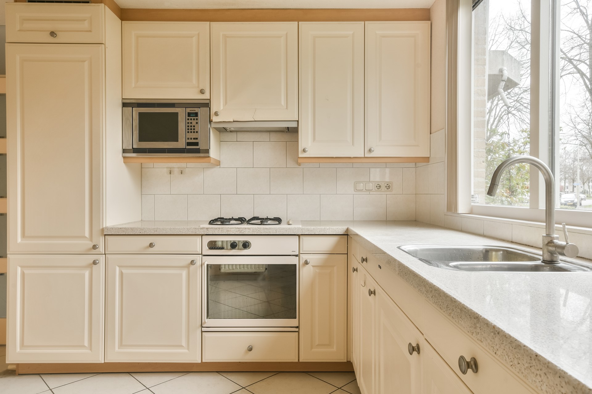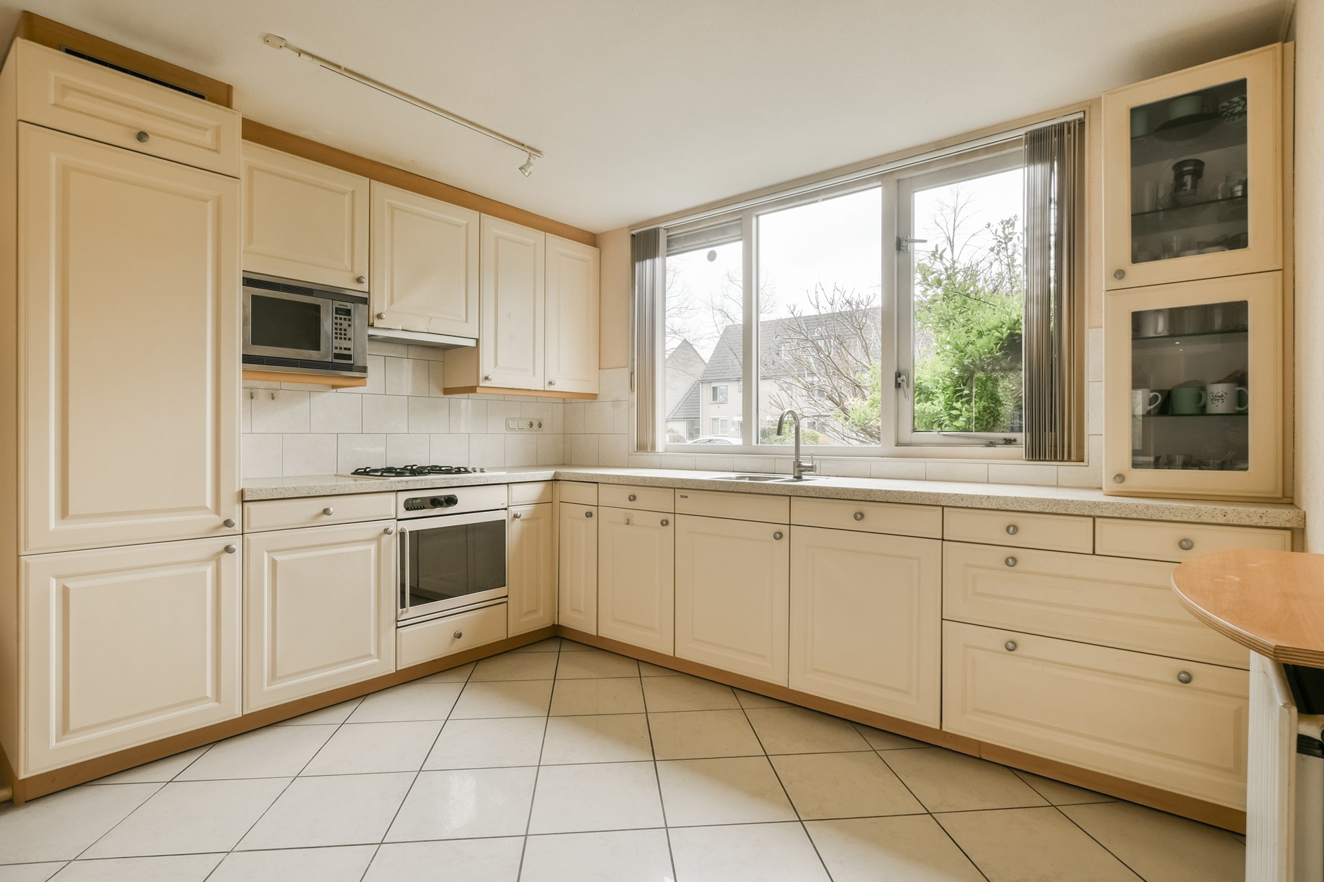 De open keuken is gesitueerd aan de voorzijde van de woning, heeft een L-opstelling en is voorzien van diverse inbouwapparatuur, waaronder een gaskookplaat, afzuigkap, oven en magnetron.
