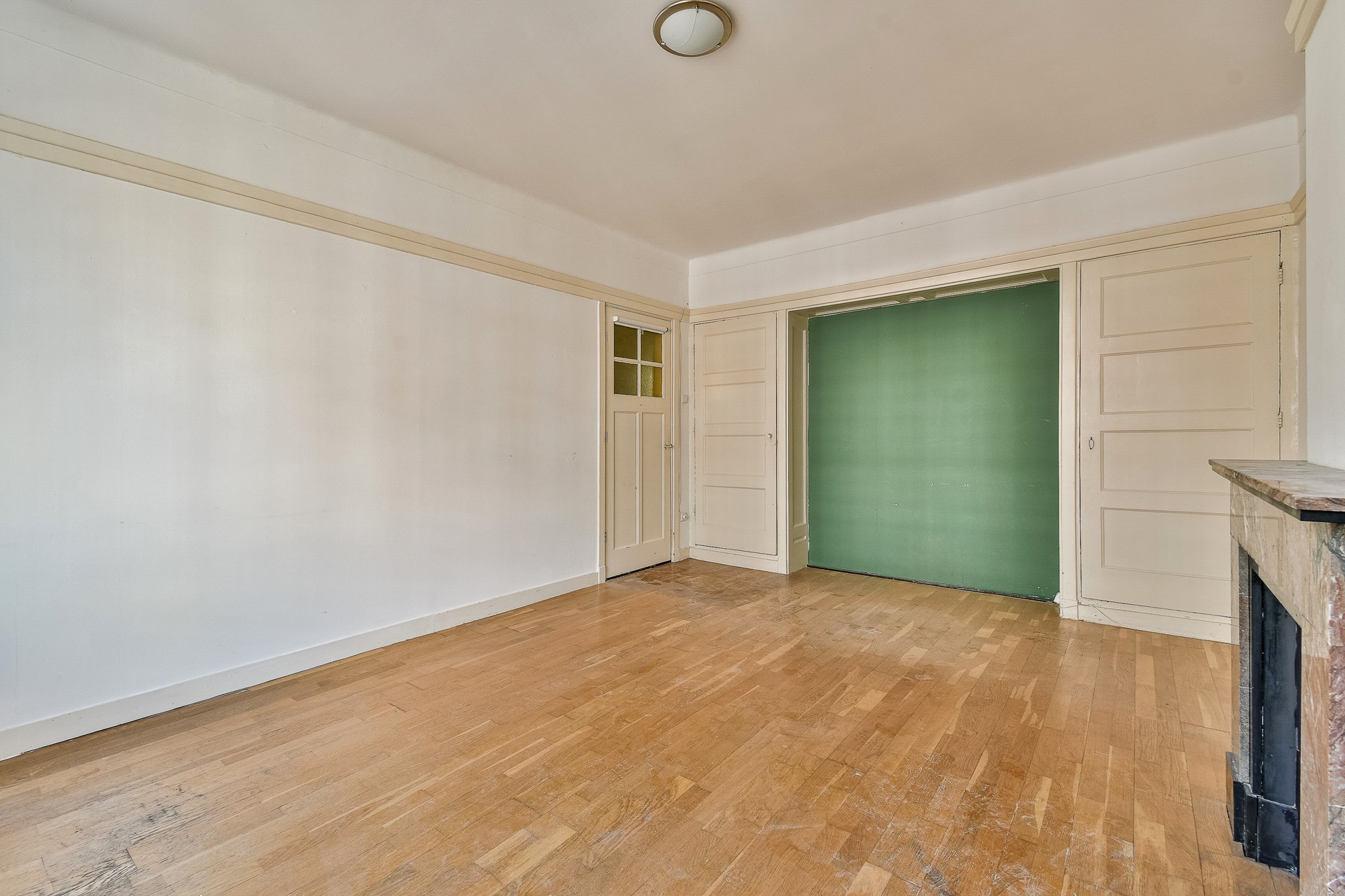Aan de voorzijde bevindt zich de lichte woonkamer, gekenmerkt door de grote raampartij en fraaie lichtinval. De ruimte beschikt over een originele schouw en biedt volop mogelijkheden voor het creëren van een comfortabel woon- en eetgedeelte.