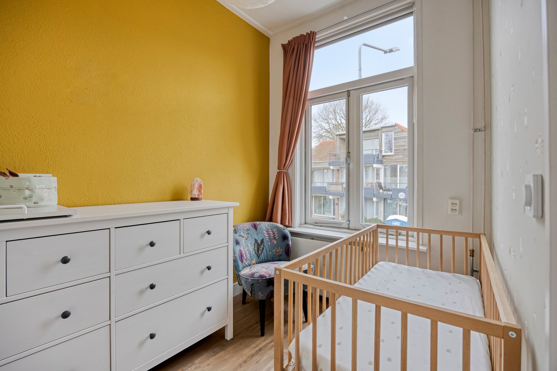 Via de overloop bereik je de lichte woonkamer aan de voorzijde, gekenmerkt door een prettige lichtinval en lage kasten aan de raamzijde. Vanuit de woonkamer bereik je een kamer welke ideaal als kinder-, werk- of logeerkamer gebruikt kan worden.