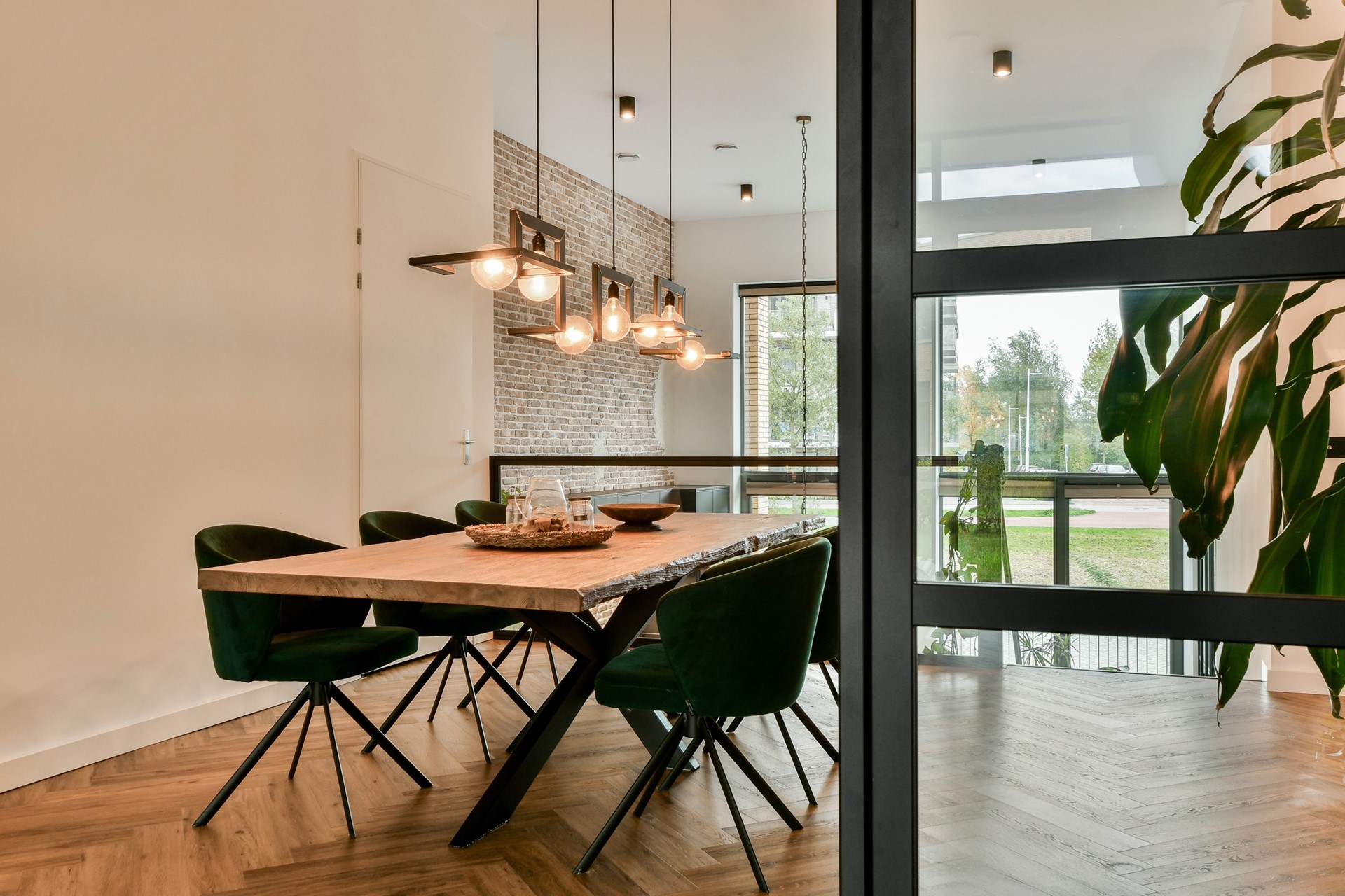 De woon- en eetkamer stralen verbondenheid en rust uit. Het stalen frame, de (over te nemen) op maat gemaakte bank en de verfijnde afwerking creëren een elegante, warme sfeer.