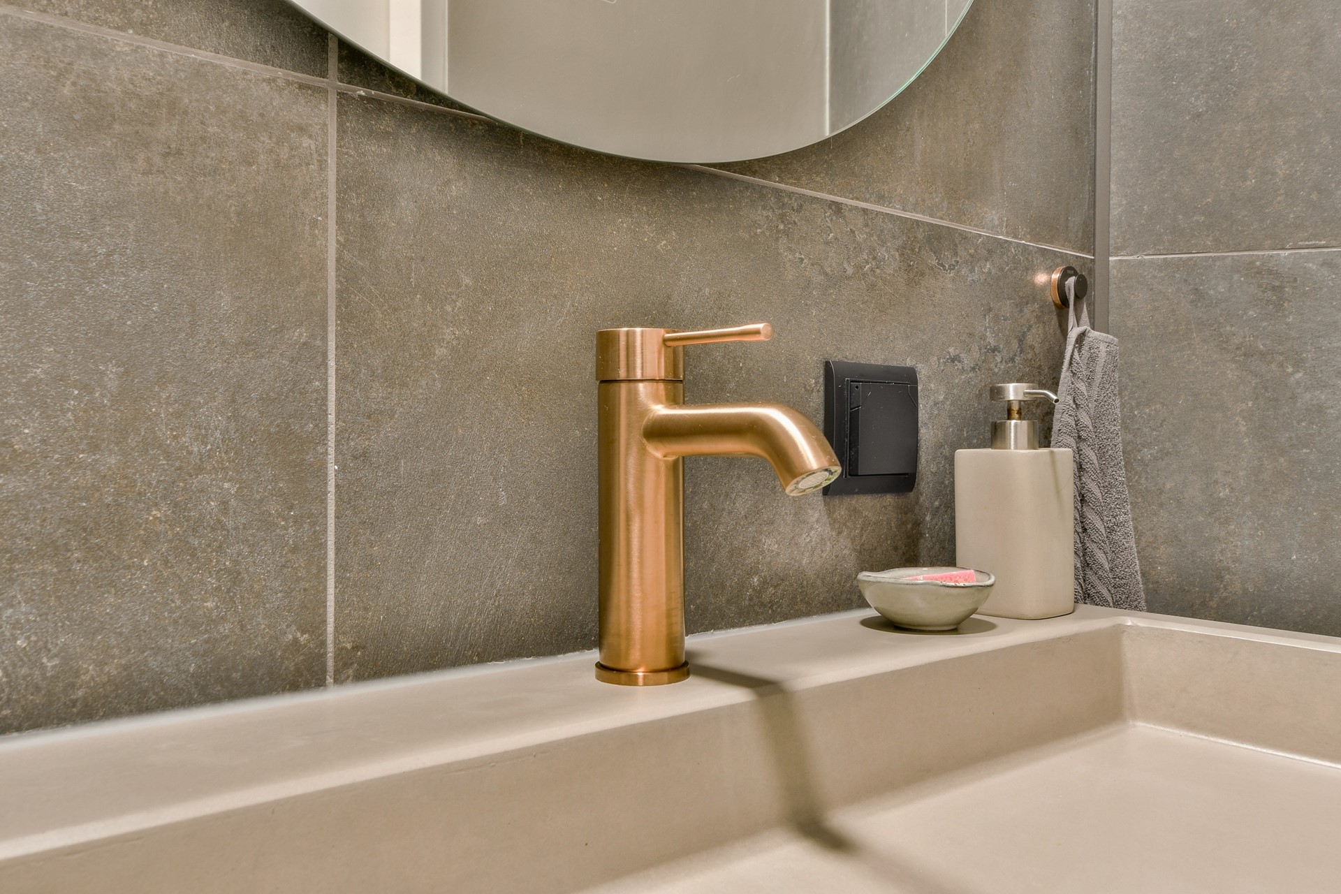 De hoofdbadkamer is afgewerkt in microcement met een waterafstotende behandeling en beschikt over een extra groot vrijstaand bad, een inloopdouche met regendouche en een op maat gemaakt wastafelmeubel in zachte, natuurlijke tinten.