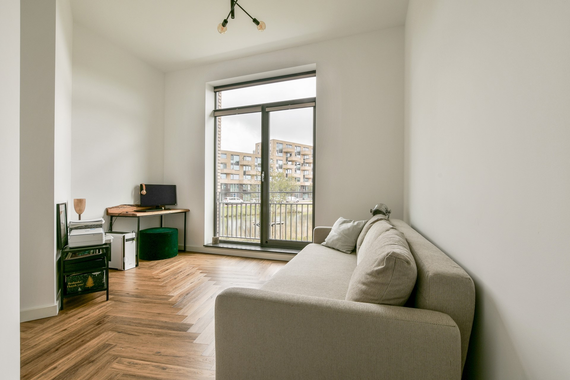De pvc-visgraatvloer loopt door in de woon- en slaapvertrekken en creëert een gevoel van rust.